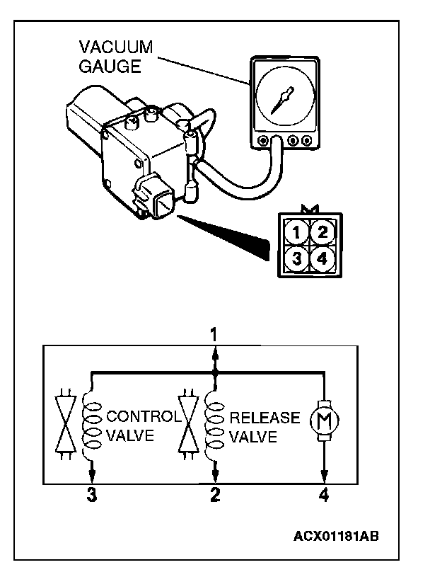 1. Connect the positive battery terminal to auto-cruise vacuum pump connector terminal 1 and the negative battery terminal to terminals 2, 3 and 4. Then the vacuum gauge should read 27 kPa (8.0 in.Hg) or more.