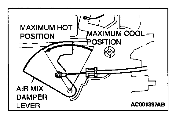 2. Set the air mix damper lever of the heater/cooler unit to the maximum hot position as shown in the illustration, and then connect the cable to the lever pin.