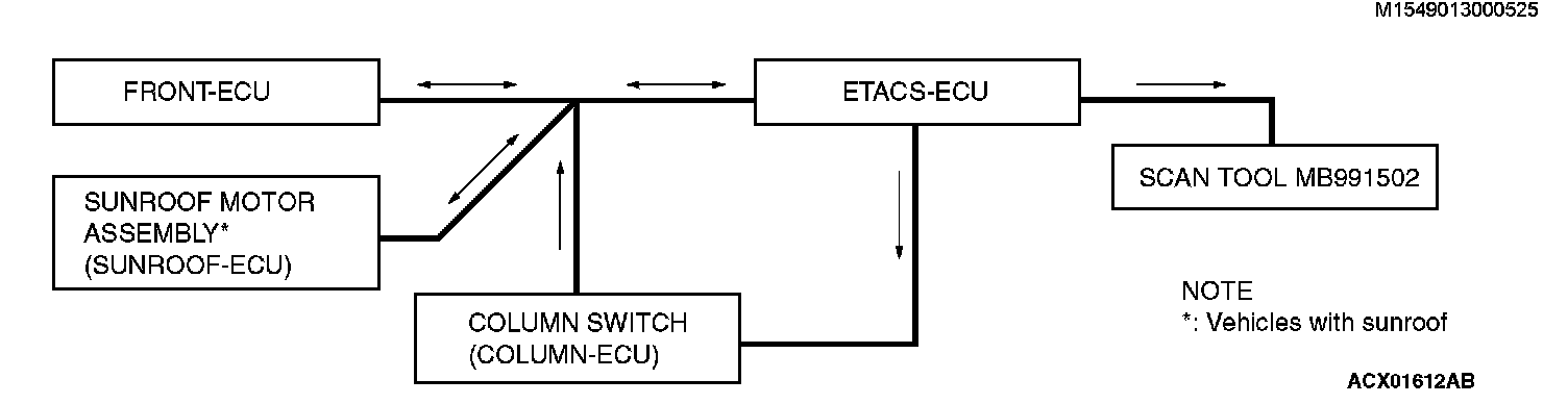As shown below, signal wires used exclusively for transmitting multiplex signal data connect the ETACS-ECU, front-ECU, column switch (incorporating the column-ECU) and sunroof motor assembly (incorporating the sunroof-ECU) and these components communicate with each other.