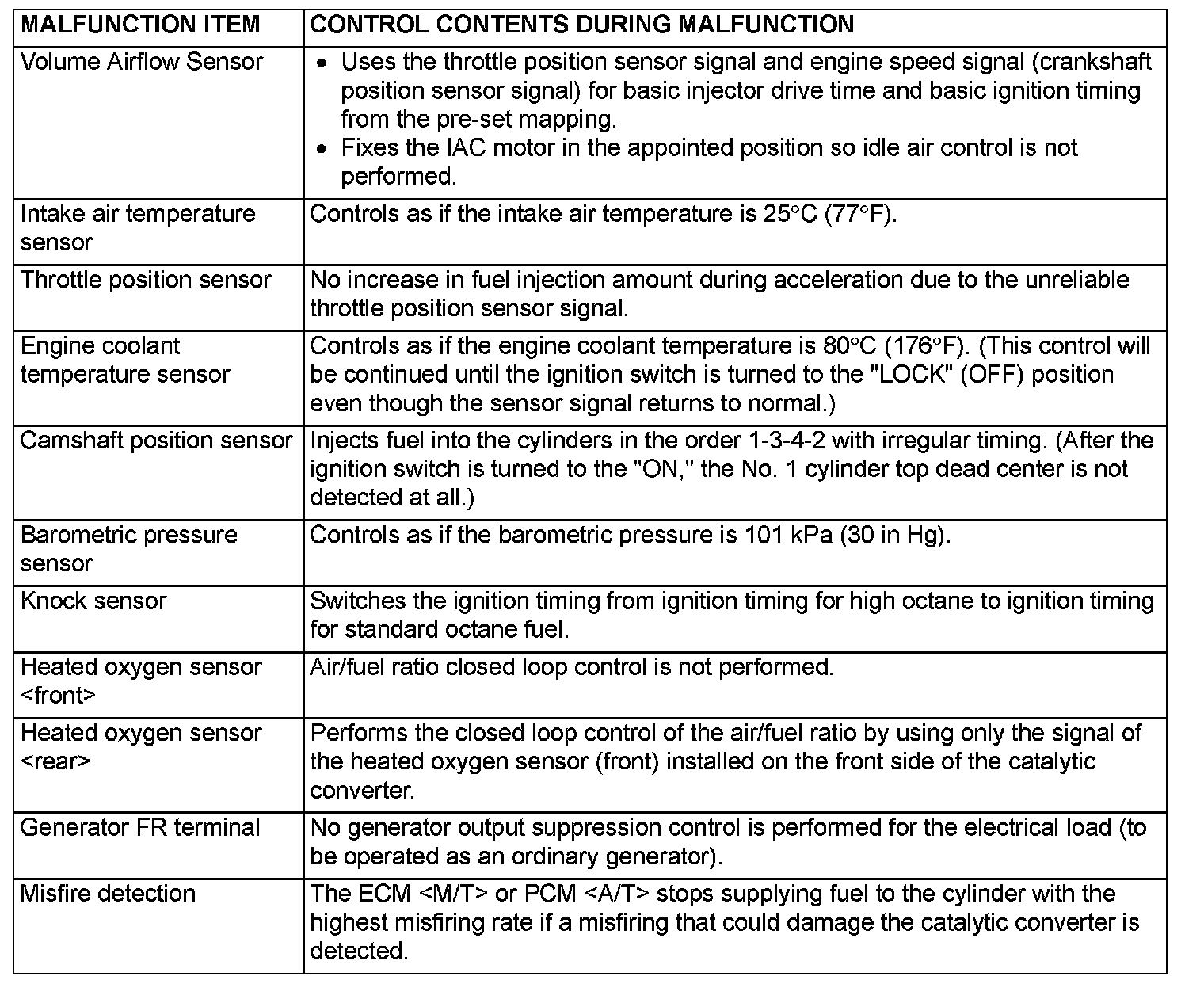 When the main sensor malfunctions are detected by the diagnostic test mode, the vehicle is controlled by means of the defaults.