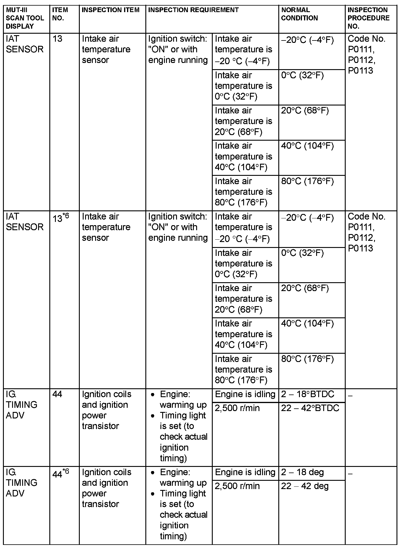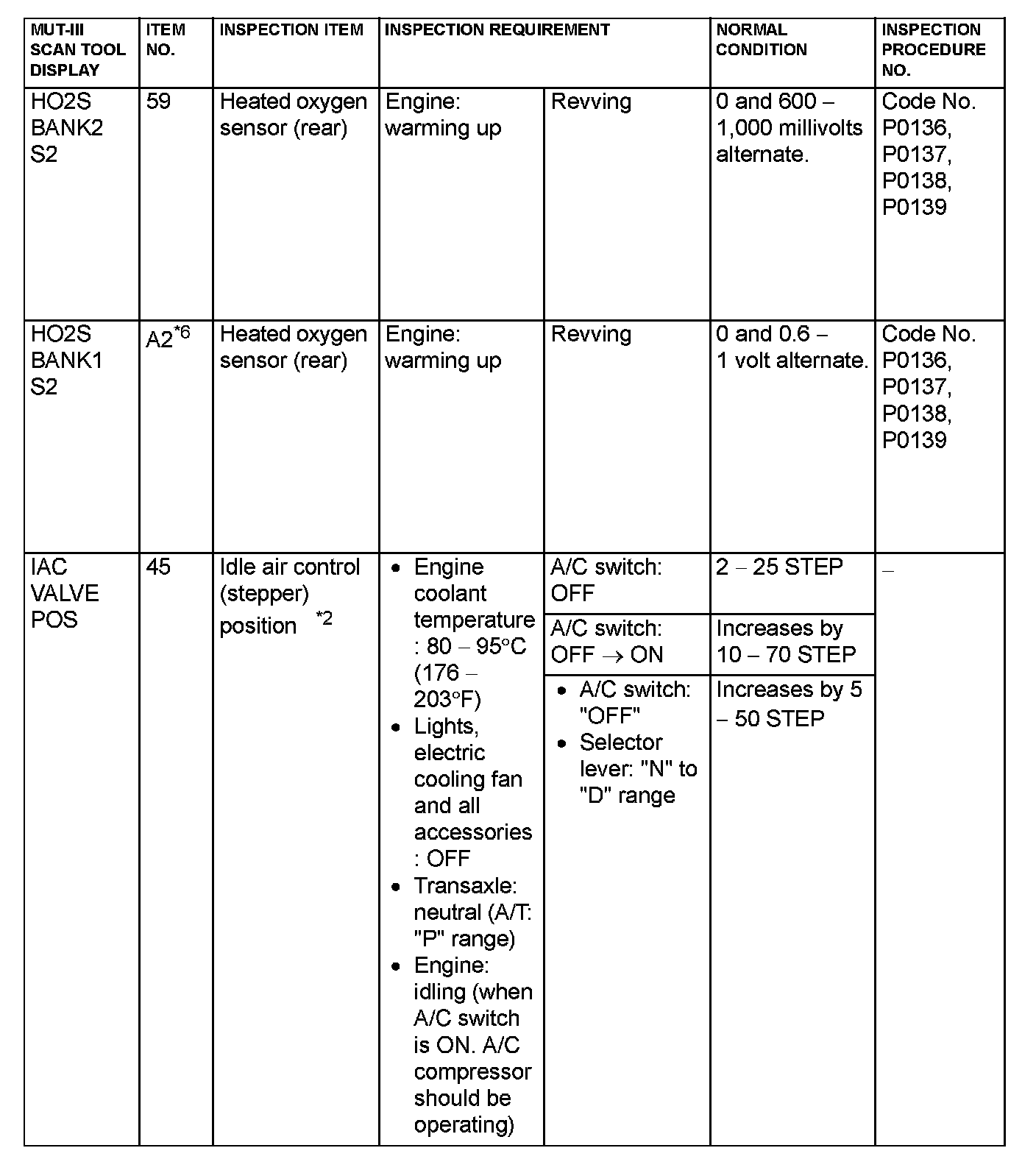 *6: GST items. [Data list items consist of MUT-III items and GST items. GST items can be accessed through the use of a general scan tool (GST). When scan tool MB991958 (MUT-III sub assembly) is used, MUT-III items appear alphabetically; then, GST items appear alphabetically. The black and white characters of the GST items are inverted from the MUT-III items.]