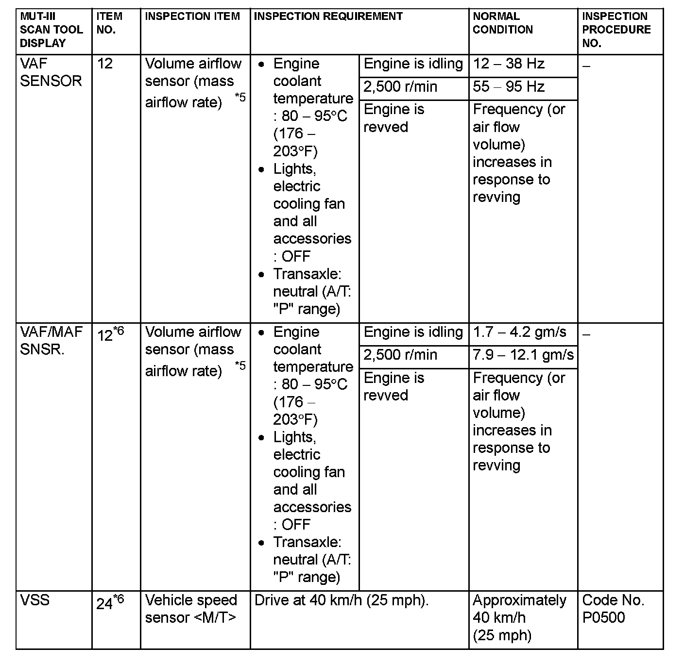 *5: In a new vehicle [driven approximately 500 km (311 mile) or less], the volume airflow sensor output frequency is sometimes 10% higher than the standard frequency.