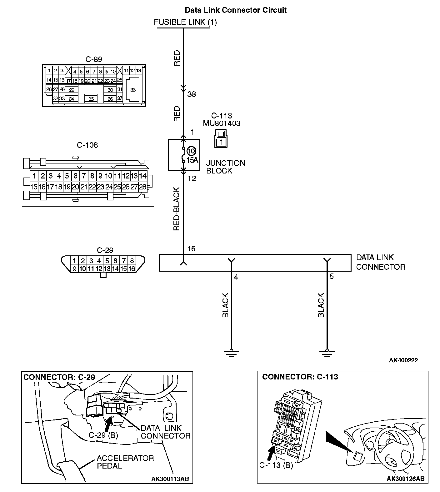 NO: Check harness connectors C-108, C-113 and C-89 at intermediate connector for damage and repair or replace as required. Refer to Harness Connector Inspection. If intermediate connectors are in good condition, repair harness wire between fusible link 1 and data link connector C-29 (terminal No. 16) because of open circuit. Then confirm that the malfunction symptom is eliminated.
