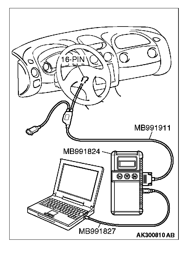CAUTION: To prevent damage to scan tool MB991958, always turn the ignition switch to the "LOCK" (OFF) position before connecting or disconnecting scan tool MB991958.