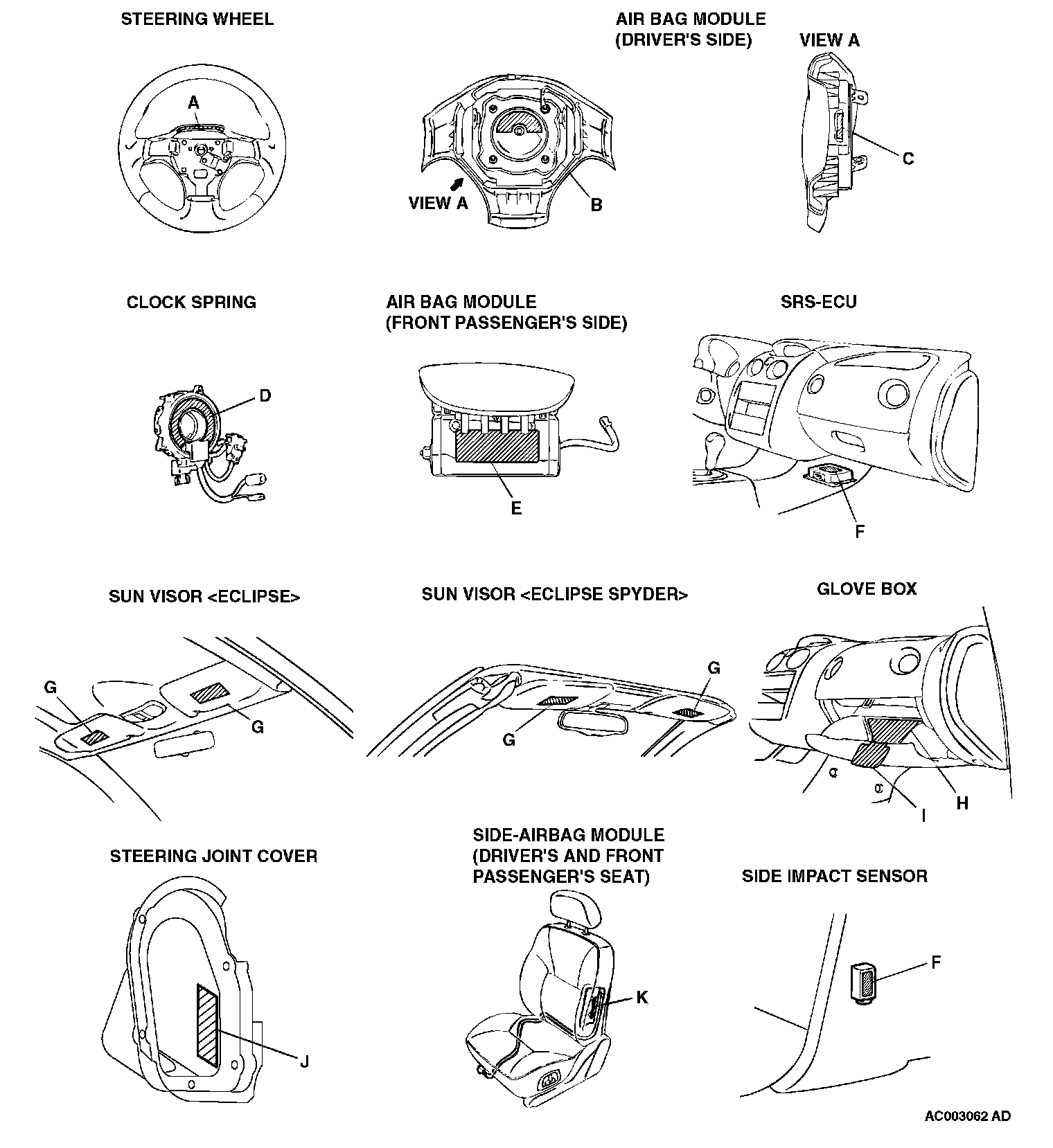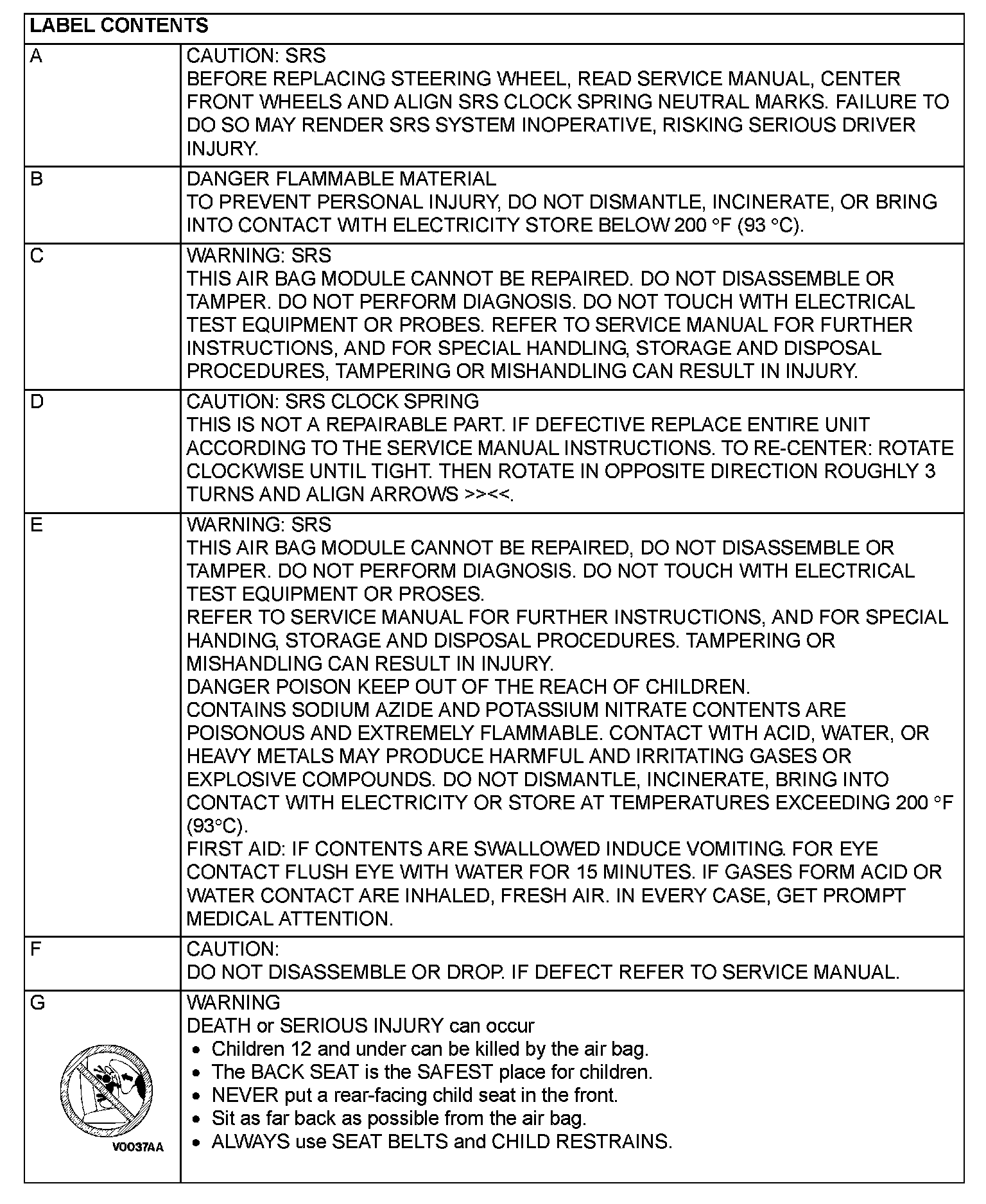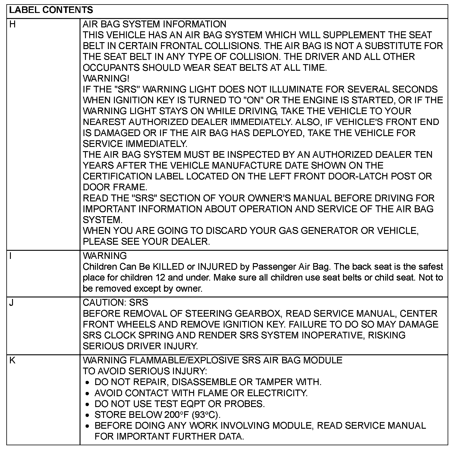 A number of caution labels related to the SRS are found in the vehicle, as shown in the following illustration. Follow label instructions when servicing SRS. The label I is not to be removed except by owner. If the other labels are dirty or damaged, replace them.