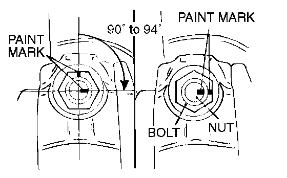 Make a paint mark on the bolt end at the position 90 degree angle to 94 degree angle from the paint mark made on the nut in the direction of tightening the nut.