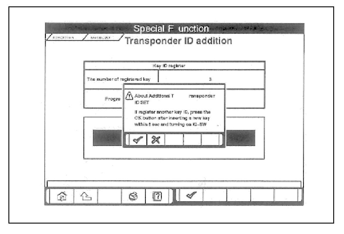 8. Follow the information on the screen. If an additional registration is made successfully, the screen will ask if another key is registered or not. If the third ignition key is registered, remove the key, which has been registered. Then insert the third key within five seconds, and then turn it to the ON position.