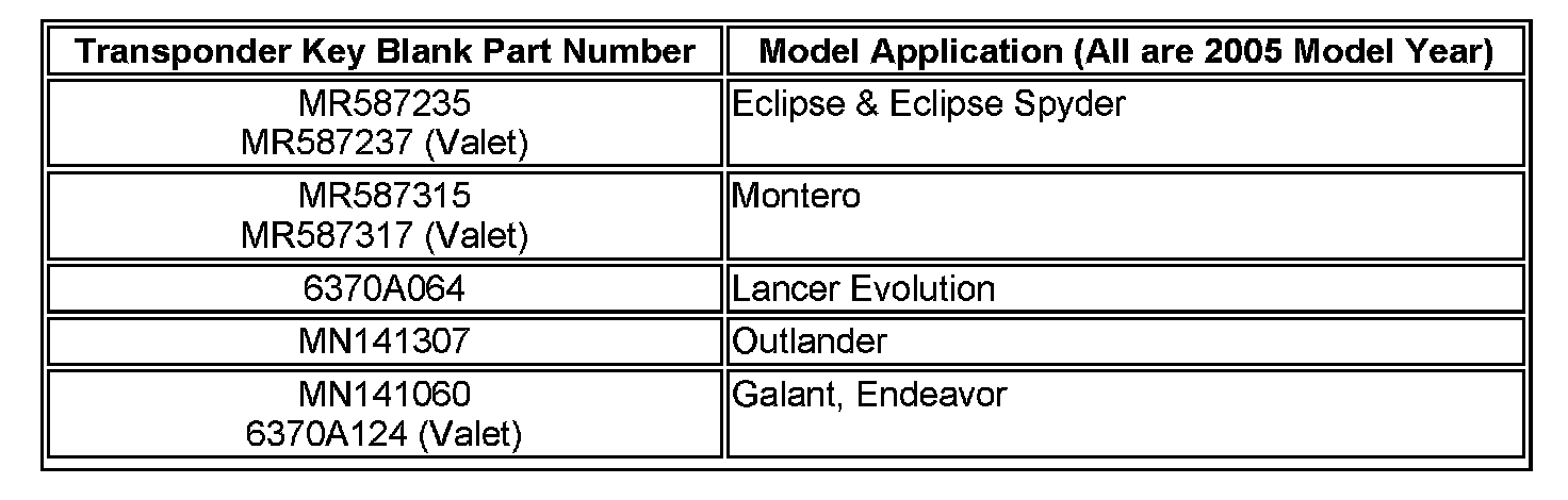 KEY BLANKS FOR 1999 AND EARLIER MODEL YEAR VEHICLES AND KEY BLANKS FOR 2002-05 LANCER (ES, LS, OZ Rally, Ralliart), 2004 LANCER SPORTBACK, 2000-02 MIRAGE, AND 2003 OUTLANDER ARE NOT TRANSPONDER EQUIPPED AND CANNOT BE REGISTERED FOR IMMOBILIZER EQUIPPED VEHICLES.
