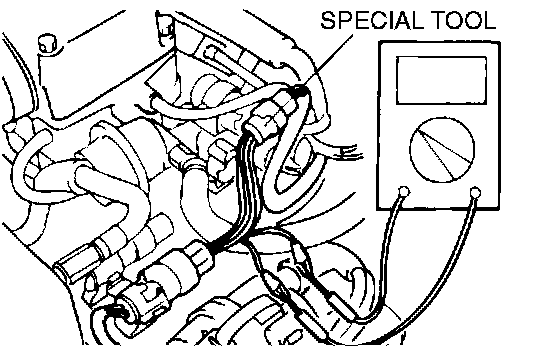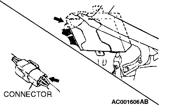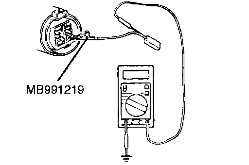 ^ The special tool MB991219 for connector pin contact pressure should be used. The test probe should never be forcibly inserted, as it may cause a defective contact.