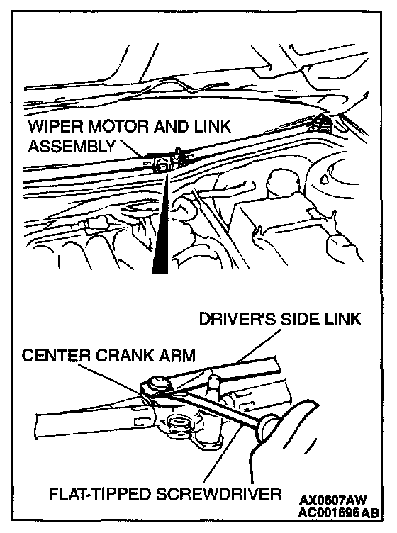 CAUTION: Be careful not to damage the windshield glass when removing the wiper motor and link assembly.