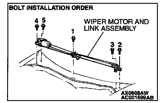 4. Install the five mounting bolts in the shown order to install the wiper motor and link assembly.