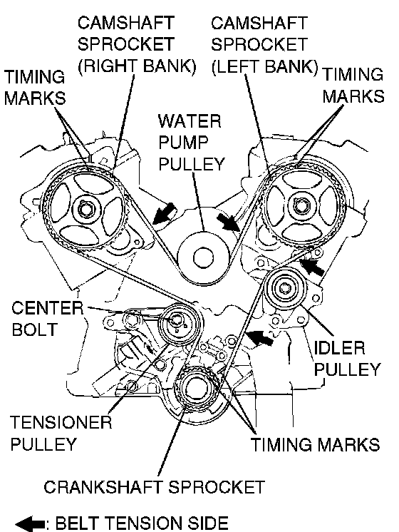 3. Turn the camshaft sprocket (Right bank) counterclockwise until the tension side of the timing belt is firmly stretched. Check all the timing marks again.