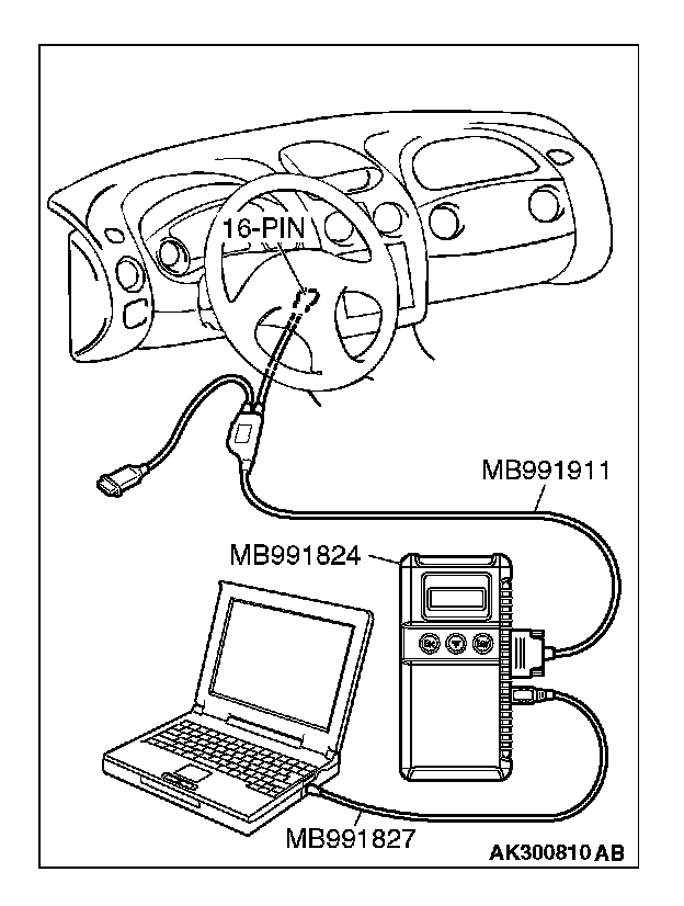 CAUTION: To prevent damage to scan tool MB991958, always turn the ignition switch to the "LOCK" (OFF) position before connecting or disconnecting scan tool MB991958.