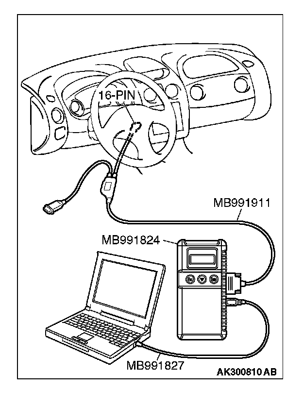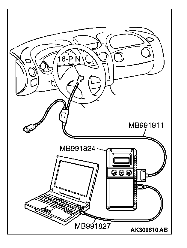 CAUTION: To prevent damage to scan tool MB991958, always turn the ignition switch to the "LOCK" (OFF) position before connecting or disconnecting scan tool MB991958.