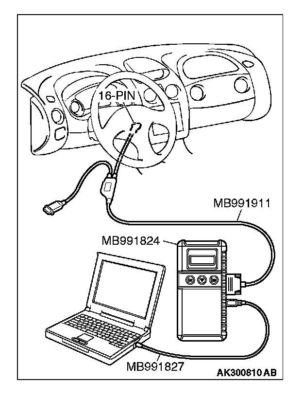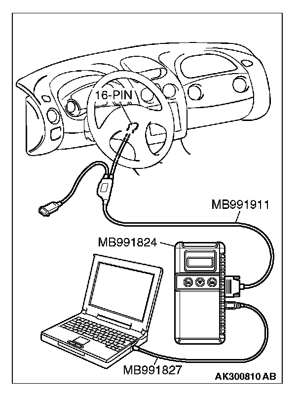 CAUTION: To prevent damage to scan tool MB991958, always turn the ignition switch to the "LOCK" (OFF) position before connecting or disconnecting scan tool MB991958.