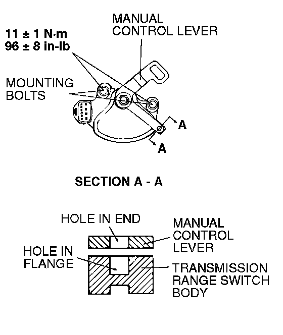 4. Loosen the transmission range switch body mounting bolts and turn the transmission range switch body so the hole in the end of the manual control lever and the hole (section A-A in the figure on the left) in the flange of the transmission range switch body flange are aligned.