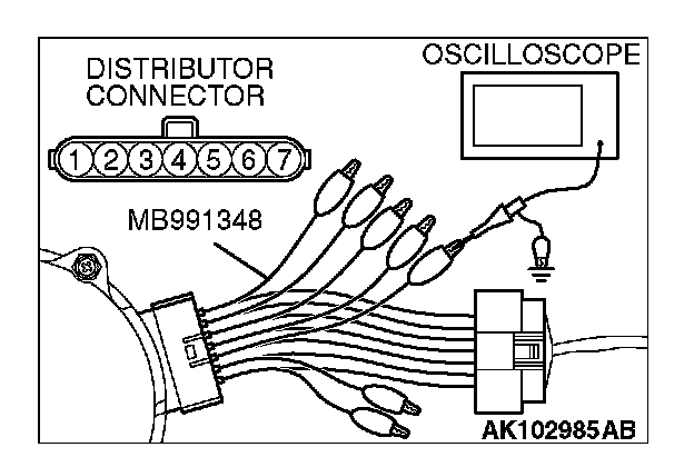 1. Disconnect the connector and connect test harness special tool, (MB991348), in between. (All terminals should be connected.)