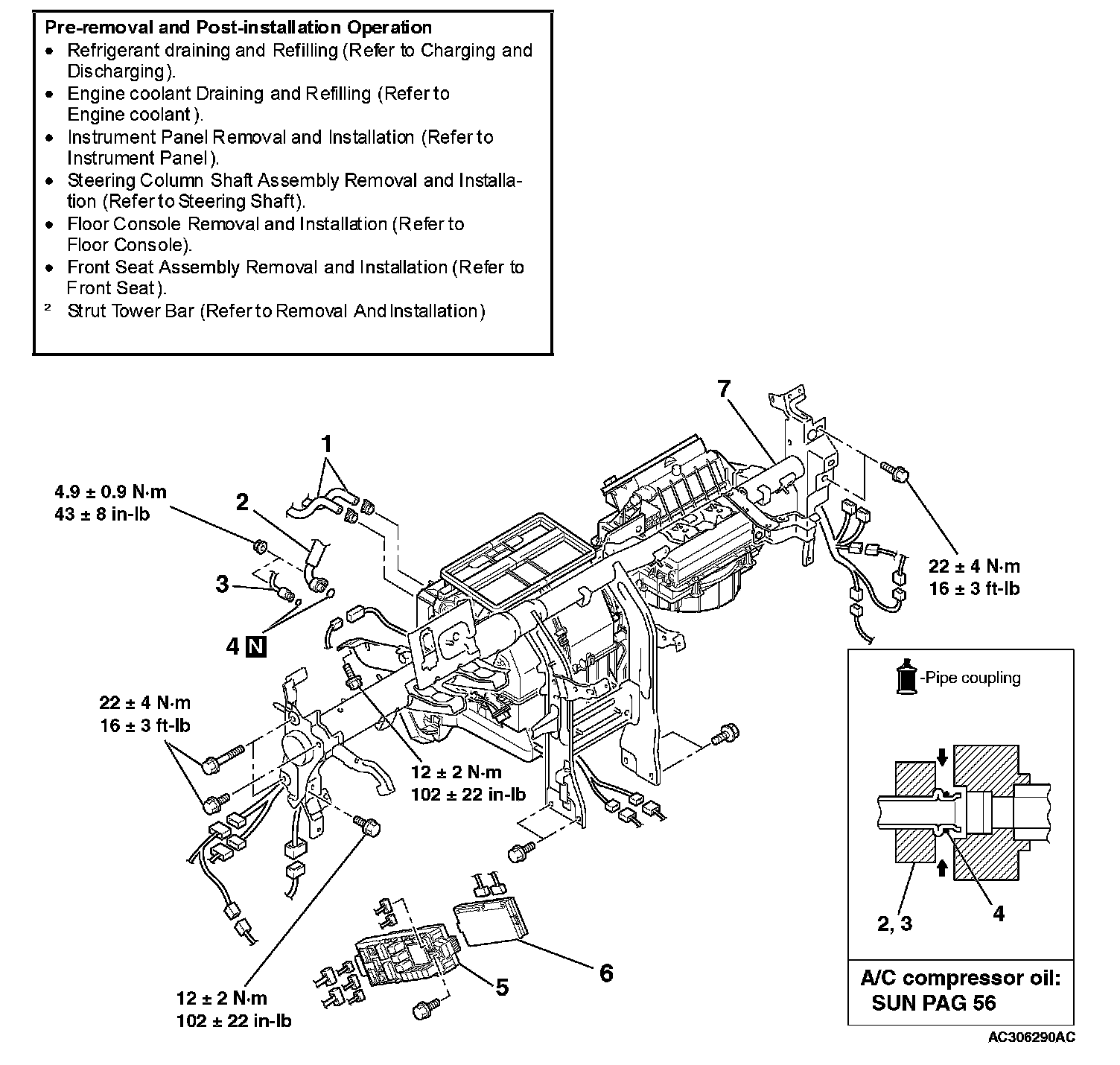 <> HEATER UNIT AND DECK CROSSMEMBER ASSEMBLY REMOVAL