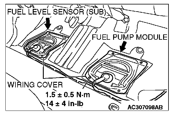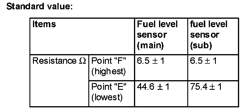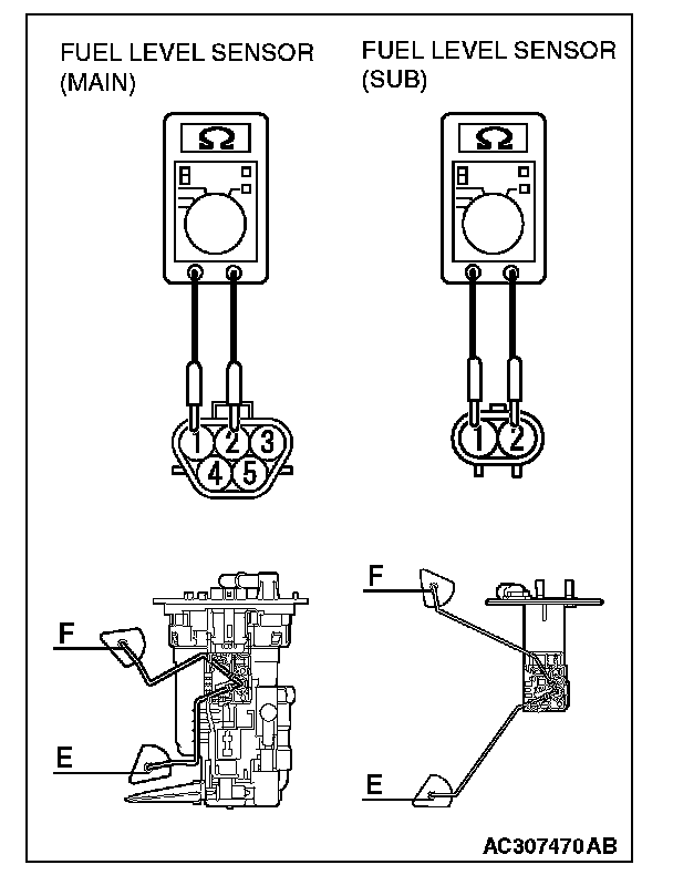 1. Check the resistances between fuel level sensor main terminals 1 and 2 as well as sub terminals 1 and 2 of the fuel pump module, respectively.