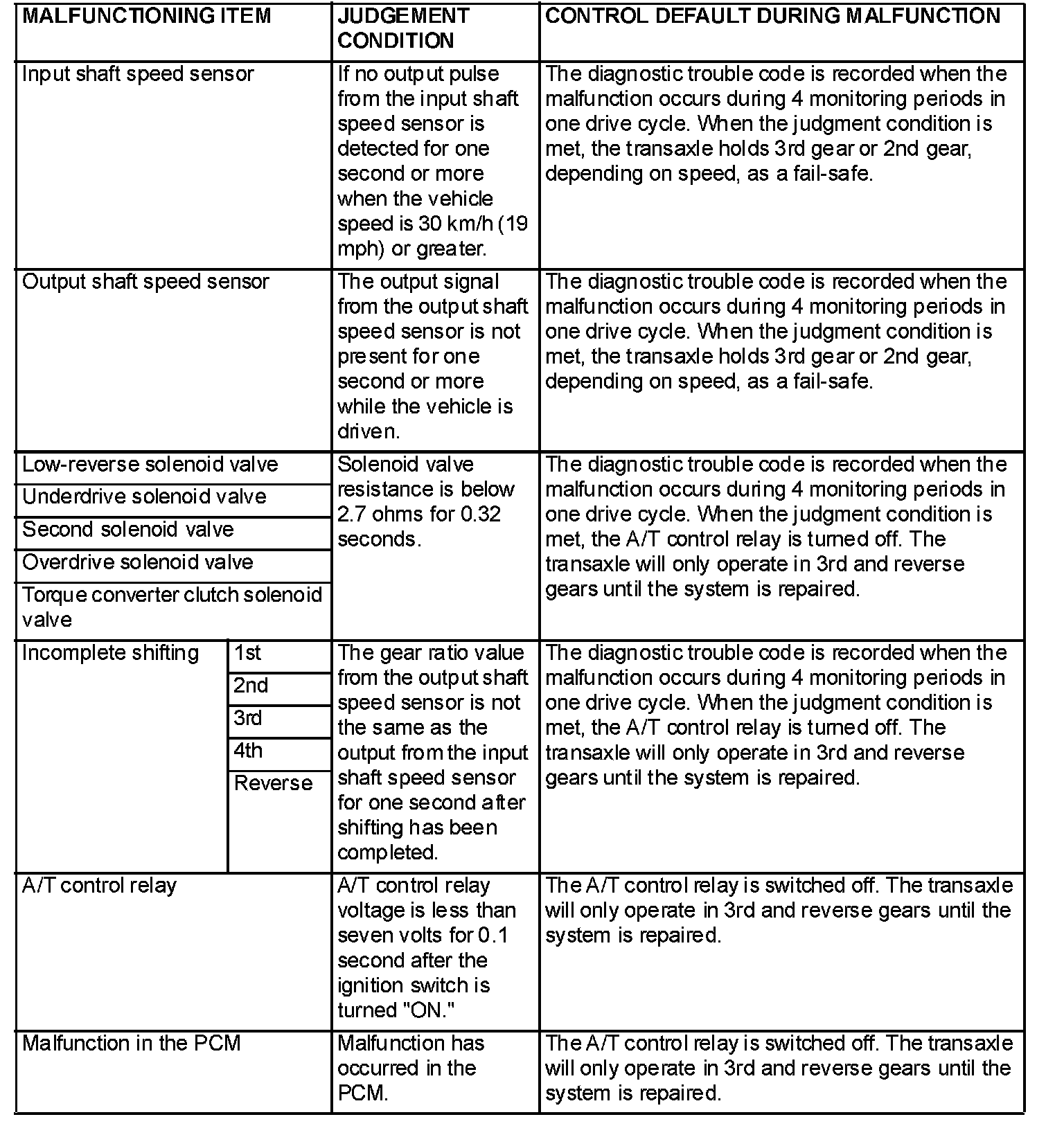 When a malfunction of a main sensor or actuator is detected by the PCM, the transaxle is controlled by pre-set control logic to maintain safe conditions for driving.