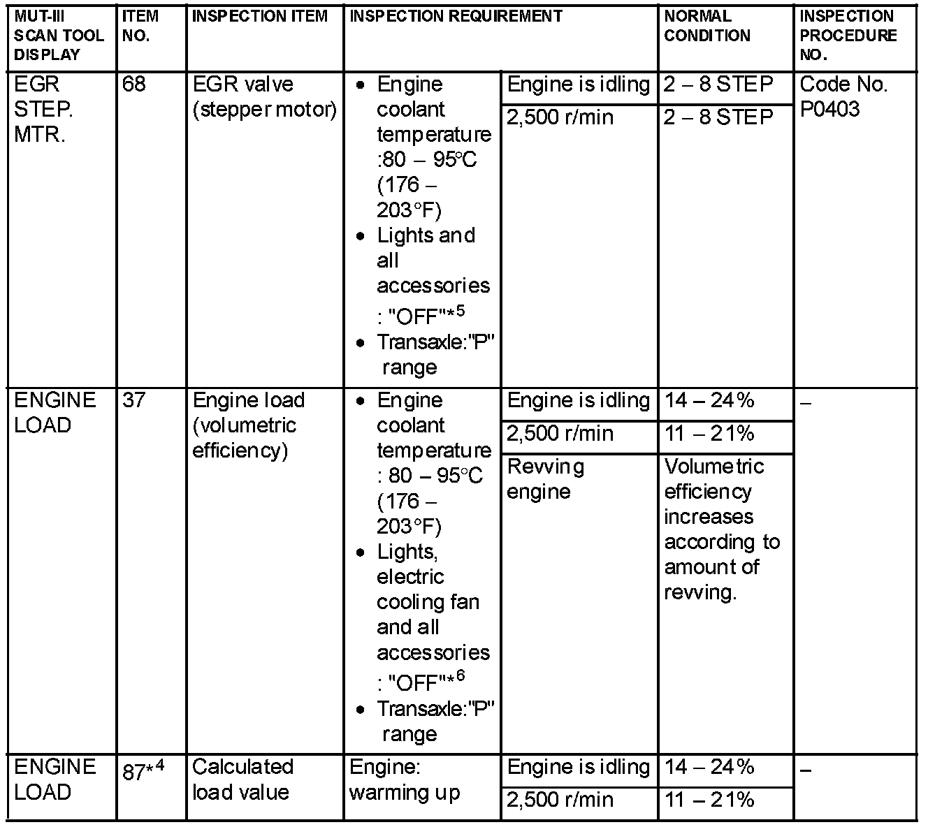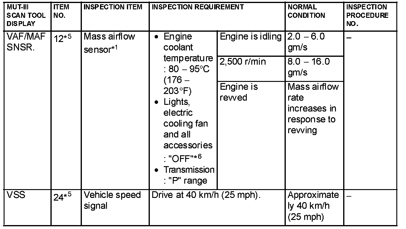NOTE: *1: In a new vehicle [driven approximately 500 km (311 mile) or less], the mass airflow sensor output value is sometimes 10% higher than the standard value.
