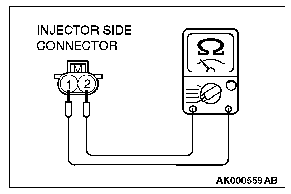 3. Measure the resistance between injector side connector terminal No. 1 and No. 2.
