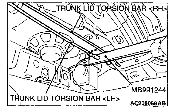 CAUTION: Install the trunk lid torsion bar [RH] before the trunk lid torsion bar [LH]. If the sequence is reversed, the trunk lid torsion bar [RH] will not be able to be installed because the special tool will interfere with the trunk lid torsion bar [LH] during installation of the trunk lid torsion bar [RH].