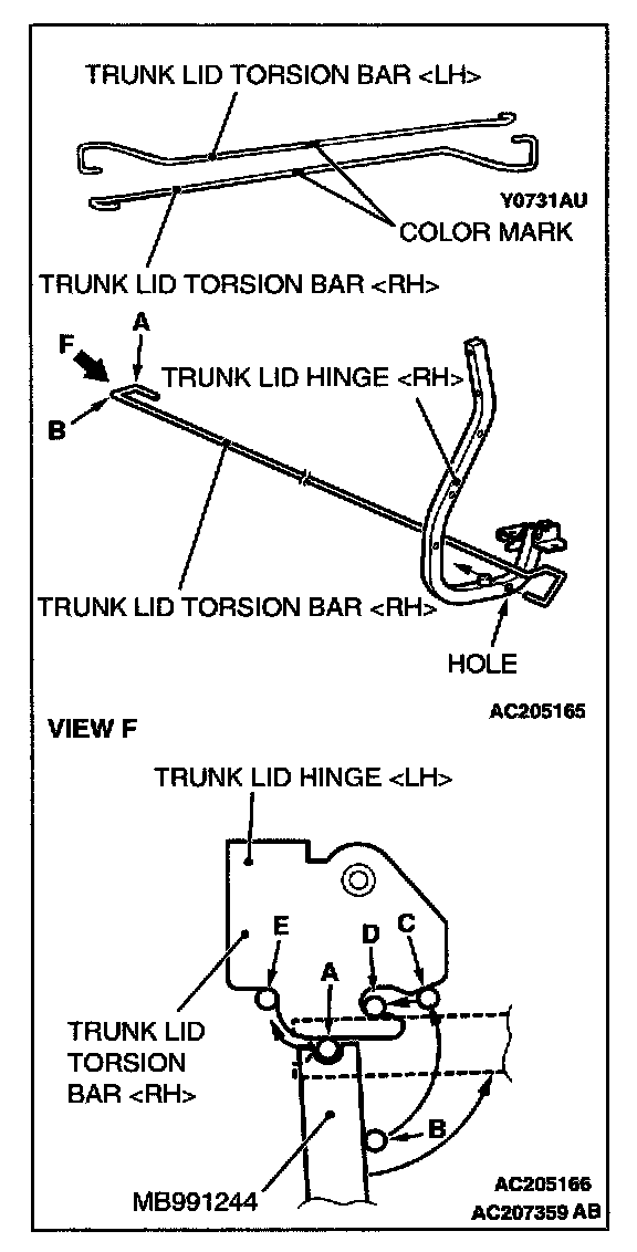 5. Twist the portion A of the trunk lid torsion bar [RH] left end until it reaches point E on the trunk lid hinge [LH] as shown in View F.