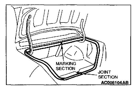 Install the trunk lid weatherstrip so that the marking and the joint are aligned with the body center line.