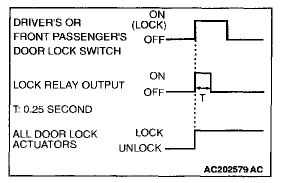 When the door is locked by driver's or front passenger's door lock switch, the ETACS-ECU energizes its door lock relay for 0.25 second to activate all the door lock actuators. Then all the doors will be locked.