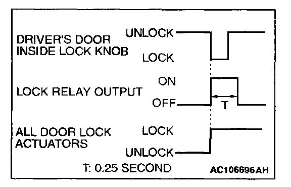 When the door is locked by driver's door inside lock knob, the ETACS-ECU energizes its door lock relay for 0.25 second to activate all the door lock actuators. Then all the doors will be locked.