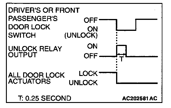 When the door is unlocked by driver's or front passenger's door lock switch, the ETACS-ECU energizes its door unlock relay for 0.25 second to activate all the door lock actuators. Then all the doors will be unlocked.