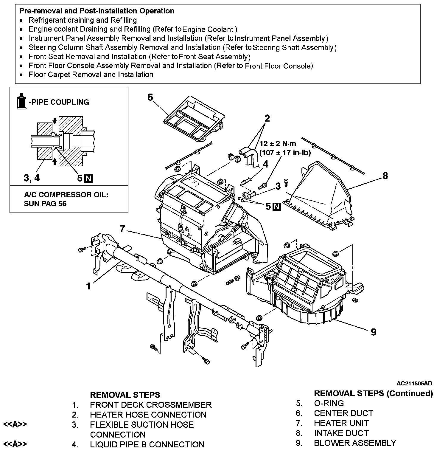 WARNING: When removing and installing the heater unit, do not let it bump against the SRS-ECU or the components.