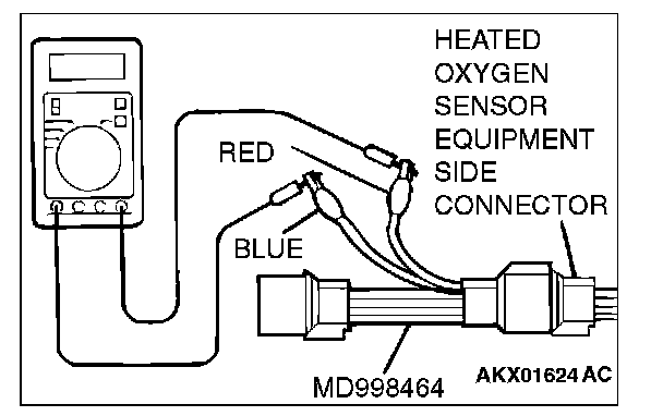 1. Disconnect the heated oxygen sensor connector and connect special tool MD998464 to the connector on the heated oxygen sensor side.