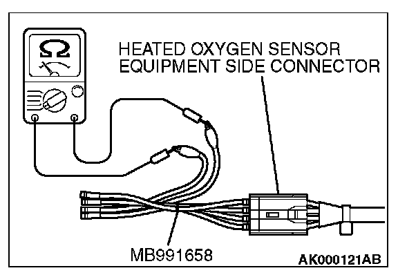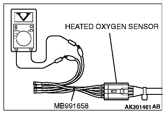 1. Disconnect the heated oxygen sensor connector and connect special tool MB991658 to the connector on the heated oxygen sensor side.