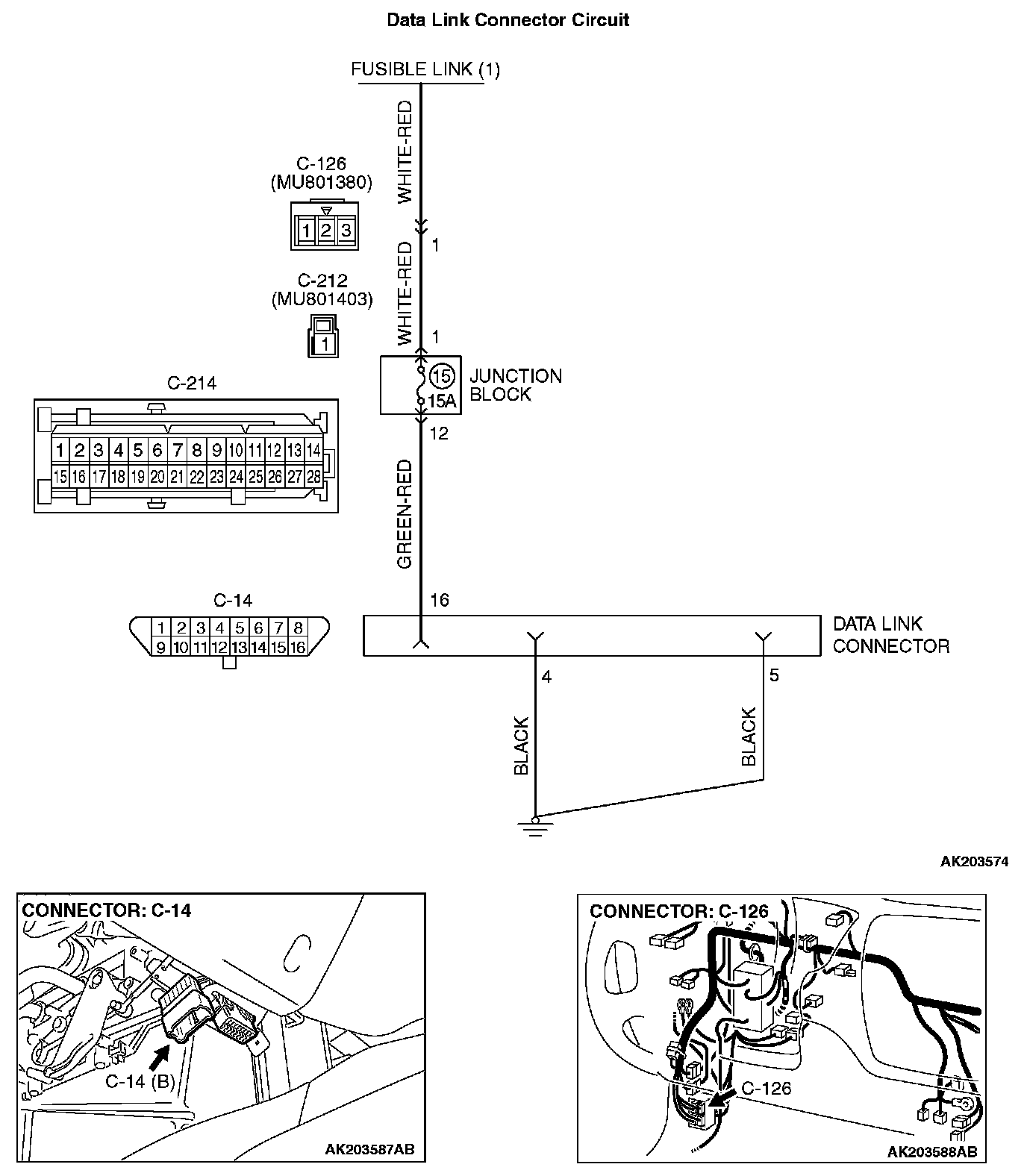 NO: Check harness connectors C-126, C-212 and C-214 at intermediate connector for damage and repair or replace as required. Refer to Harness Connector Inspection. If intermediate connectors are in good condition repair harness wire between fusible link 1.and data link connector C-14 (terminal No.16) because of open circuit. Then confirm that the malfunction symptom is eliminated.