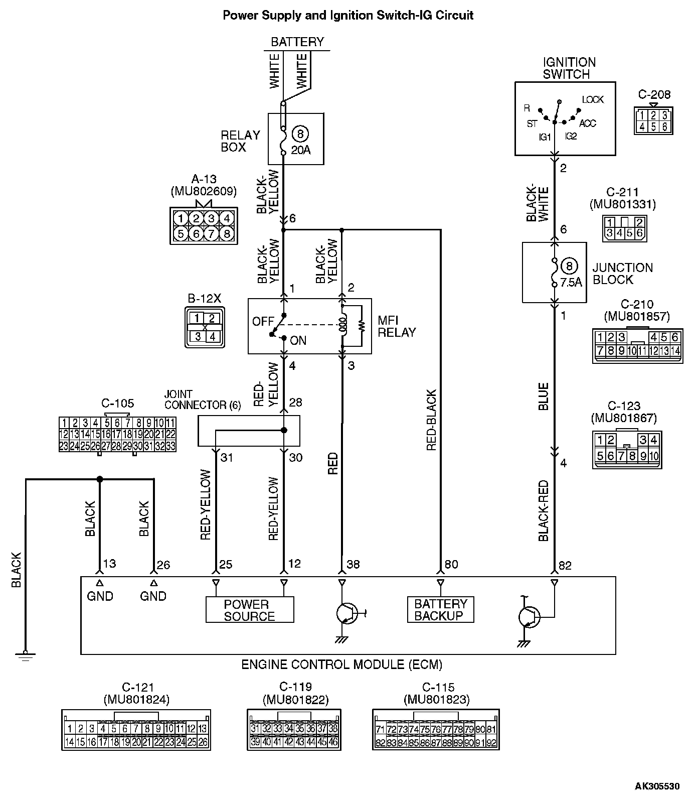 - When the ignition switch is turned to the "ON" position the battery positive voltage is applied to the ECM (terminal No.82). When the battery positive voltage is applied the ECM turns the power transistor in the ECM "ON" and grounds the MFI relay coil. With this the MFI relay turns "ON" and the battery positive voltage is supplied to the ECM (terminals No.12 No.25) from the MFI relay (terminal No.4).