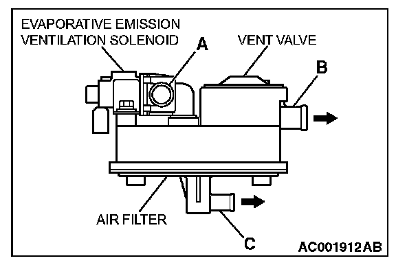 ORVR VENT VALVE MODULE CHECK1. Blow air through orvr vent valve module nipple (A). Check that the air flows out of nipple (B) and nipple (C).