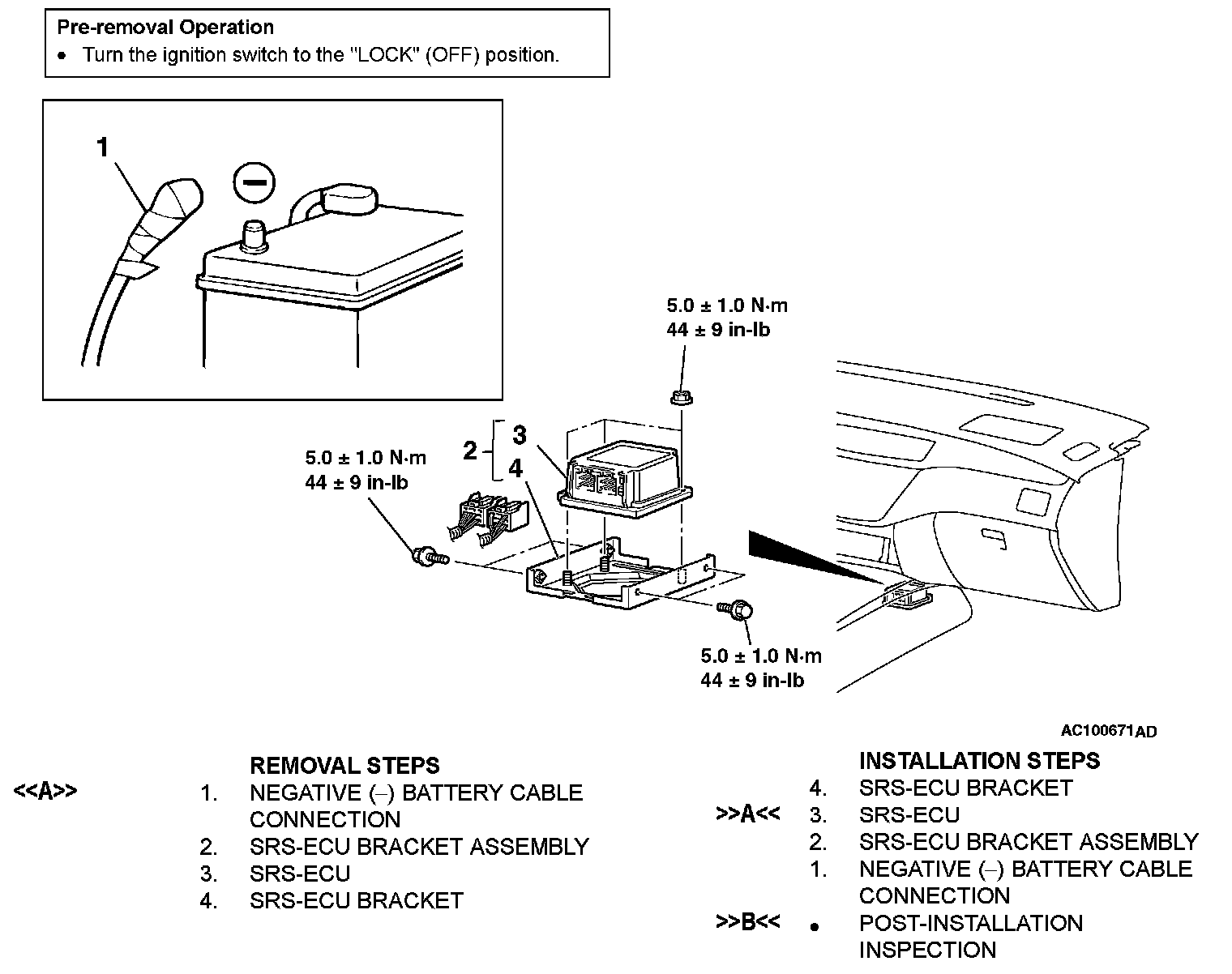 SRS CONTROL UNIT (SRS-ECU)REMOVAL AND INSTALLATION