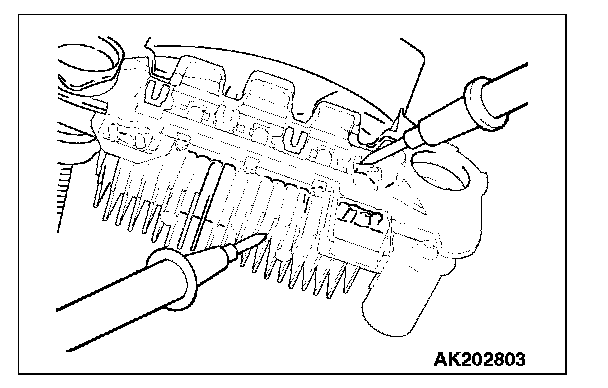 1. Check the condition of the (+) heat sink by checking continuity between the (+) heat sink and each of the stator coil lead connecting terminals.