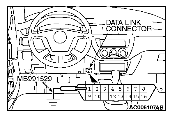 CAUTION: Turn the ignition switch to the "LOCK" (OFF) position and then connect special tool MB991824 (V.C.I.) to the data link connector.
