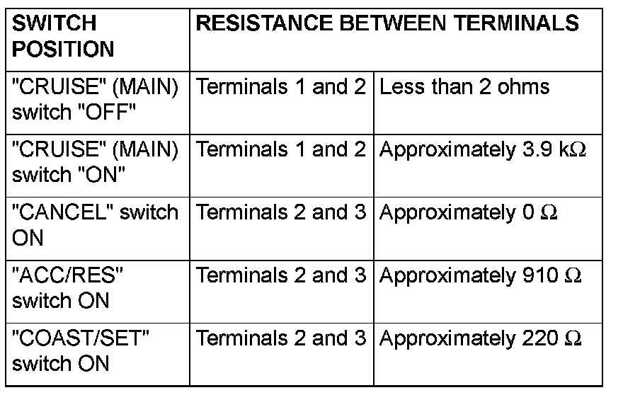 Measure the resistance between the terminals when each of the "COAST/SET", "ACC/RES", "CANCEL" and "CRUISE" (MAIN) switches is pressed. If the values measured at the time correspond to those shown in the table, the resistance values are correct.