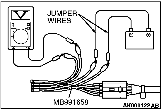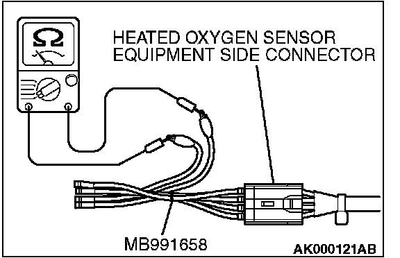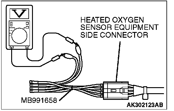 1. Disconnect the heated oxygen sensor connector and connect special tool MB991658 to the connector on the heated oxygen sensor side.