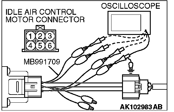 2. Connect the oscilloscope probe to the idle air control motor connector terminal No.1, terminal No.3, terminal No.4 and terminal No.6 respectively.