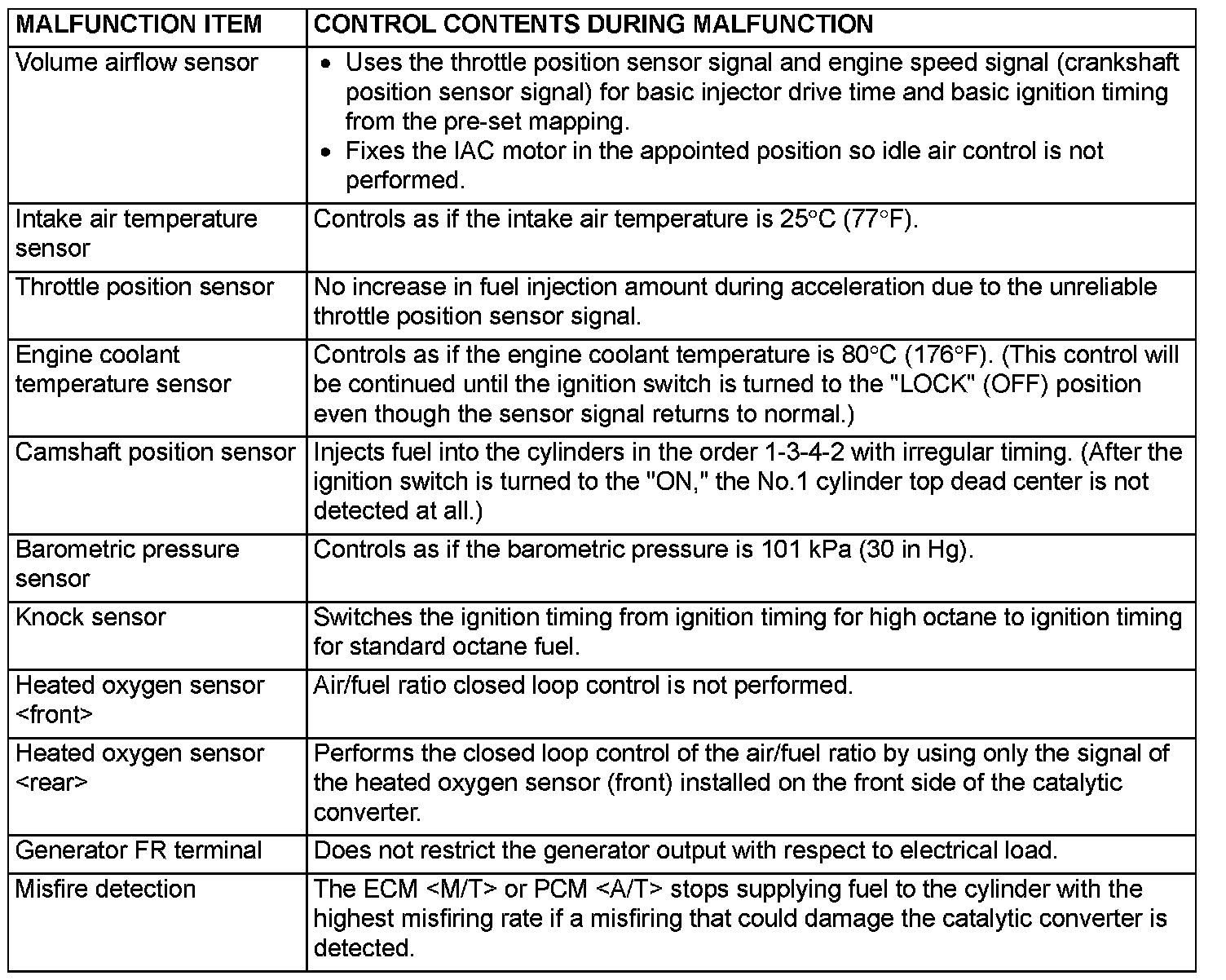 When the main sensor malfunctions are detected by the diagnostic test mode, the vehicle is controlled by means of the given defaults.
