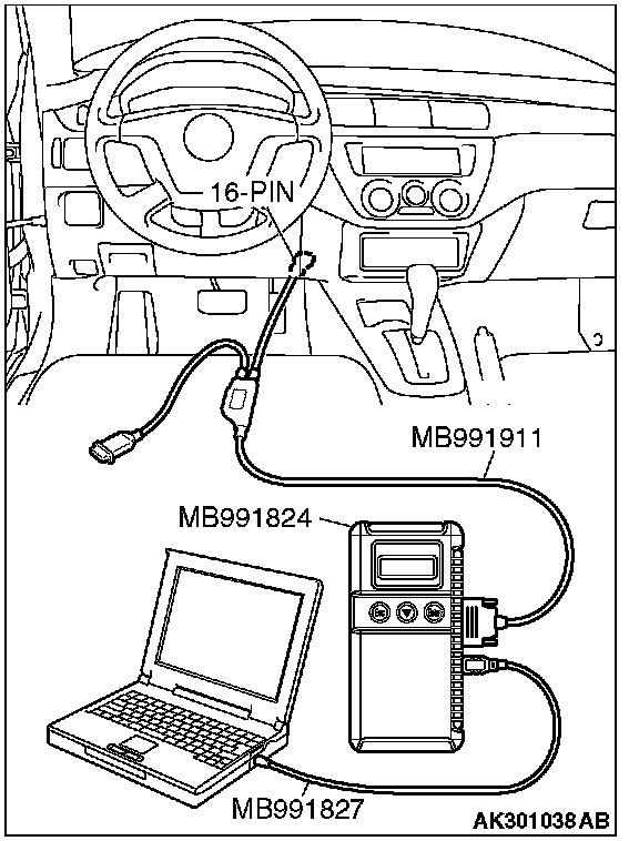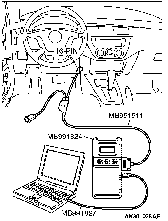 CAUTION: To prevent damage to scan tool MB991958, always turn the ignition switch to the "LOCK" (OFF) position before connecting or disconnecting scan tool MB991958.