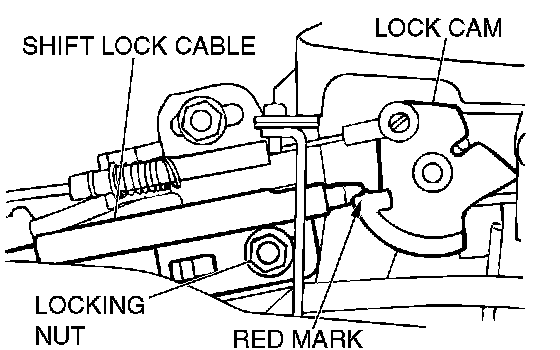 4) Adjust the cable so that the end of the shift lock cable is above the red line on the lock cam and tighten the locknut.