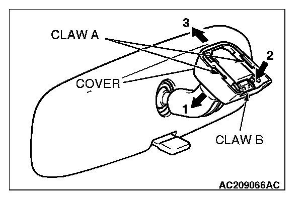 Push claw B in the arrow 2 direction to unlock, and pull out the mirror in the arrow 3 direction.
