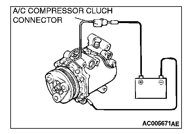 Connect the compressor connector terminal to the battery positive (+) terminal and ground the battery s negative (-) terminal to the compressor unit. At that time, the magnetic clutch should make a definite operating sound.