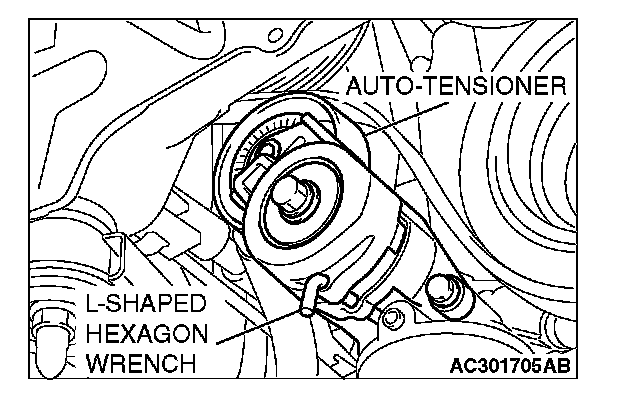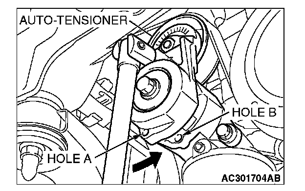 2. Rotate the auto-tensioner counterclockwise and align hole A with hole B.